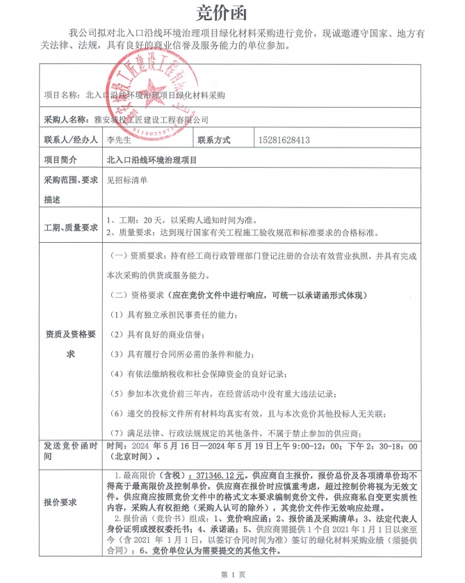 北入口沿線環(huán)境治理項(xiàng)目綠化材料采購競價公告