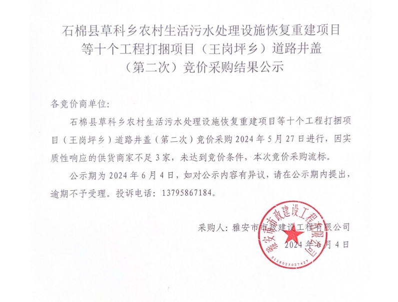 石棉縣草科鄉(xiāng)農(nóng)村生活污水處理設(shè)施恢復(fù)重建項(xiàng)目等十個工程打捆項(xiàng)目(王崗坪鄉(xiāng))道路井蓋(第二次)競價采購結(jié)果公示
