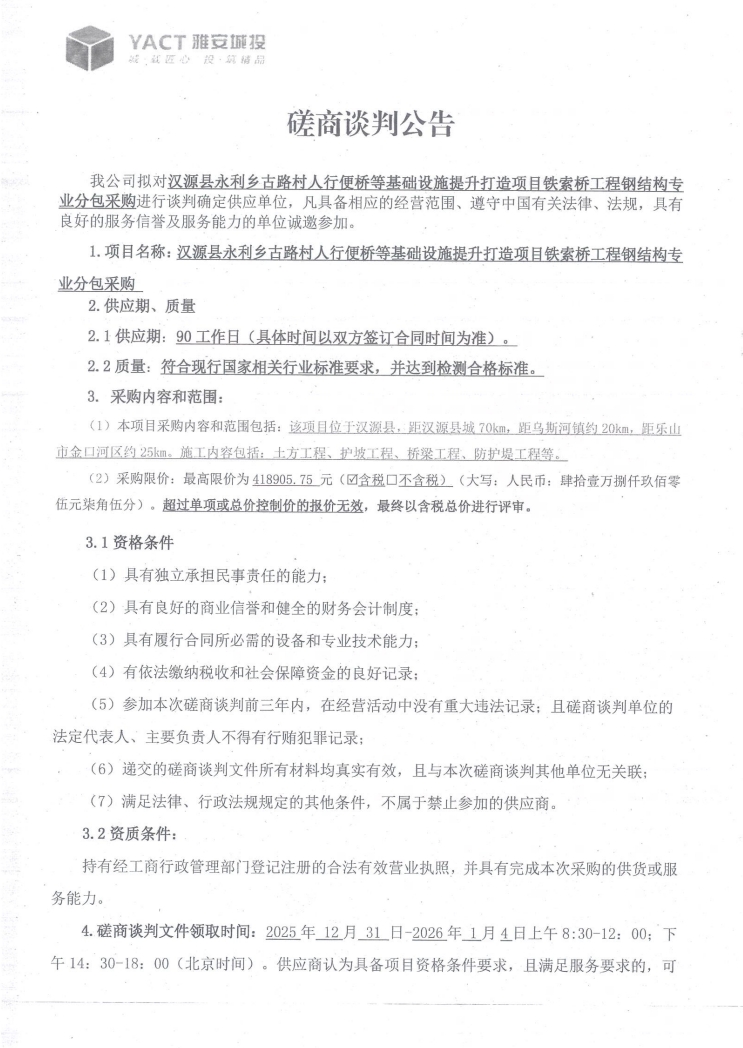 漢源縣永利古路村人行便橋等基礎設施提升打造項目鐵索橋工程鋼結構專業(yè)分包采購磋商談判公告