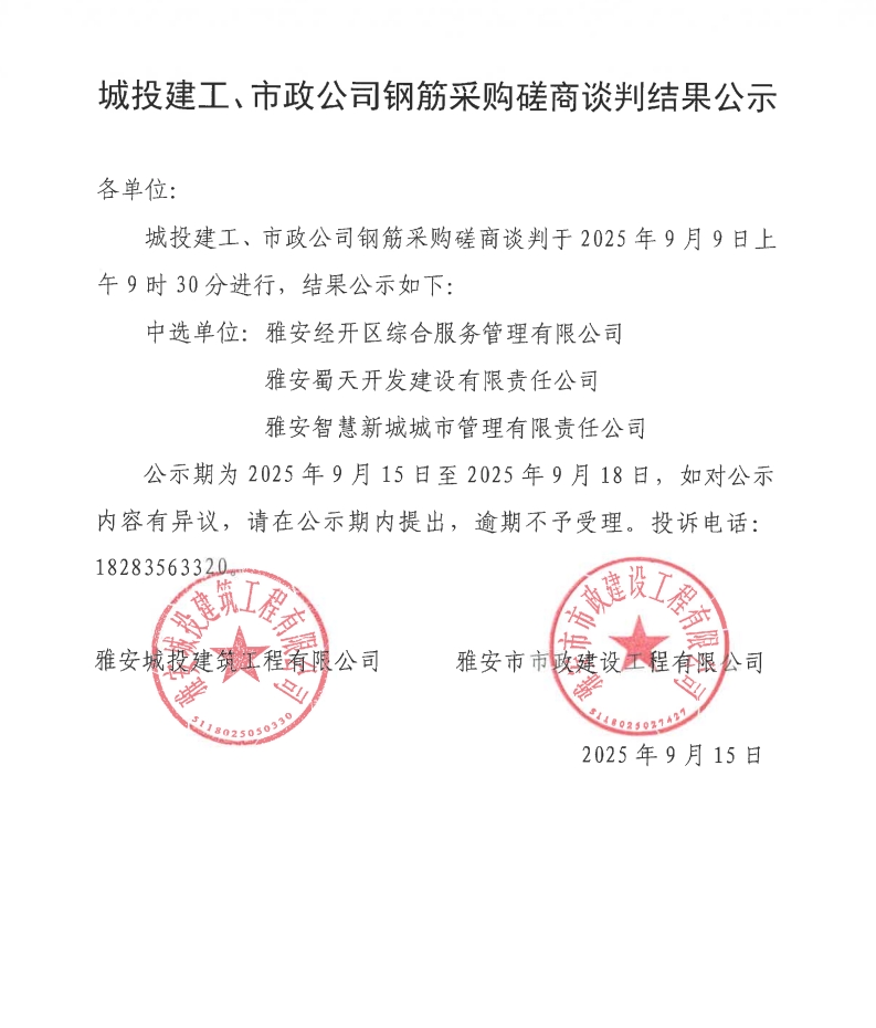城投建工、市政公司鋼筋采購(gòu)磋商談判結(jié)果公示